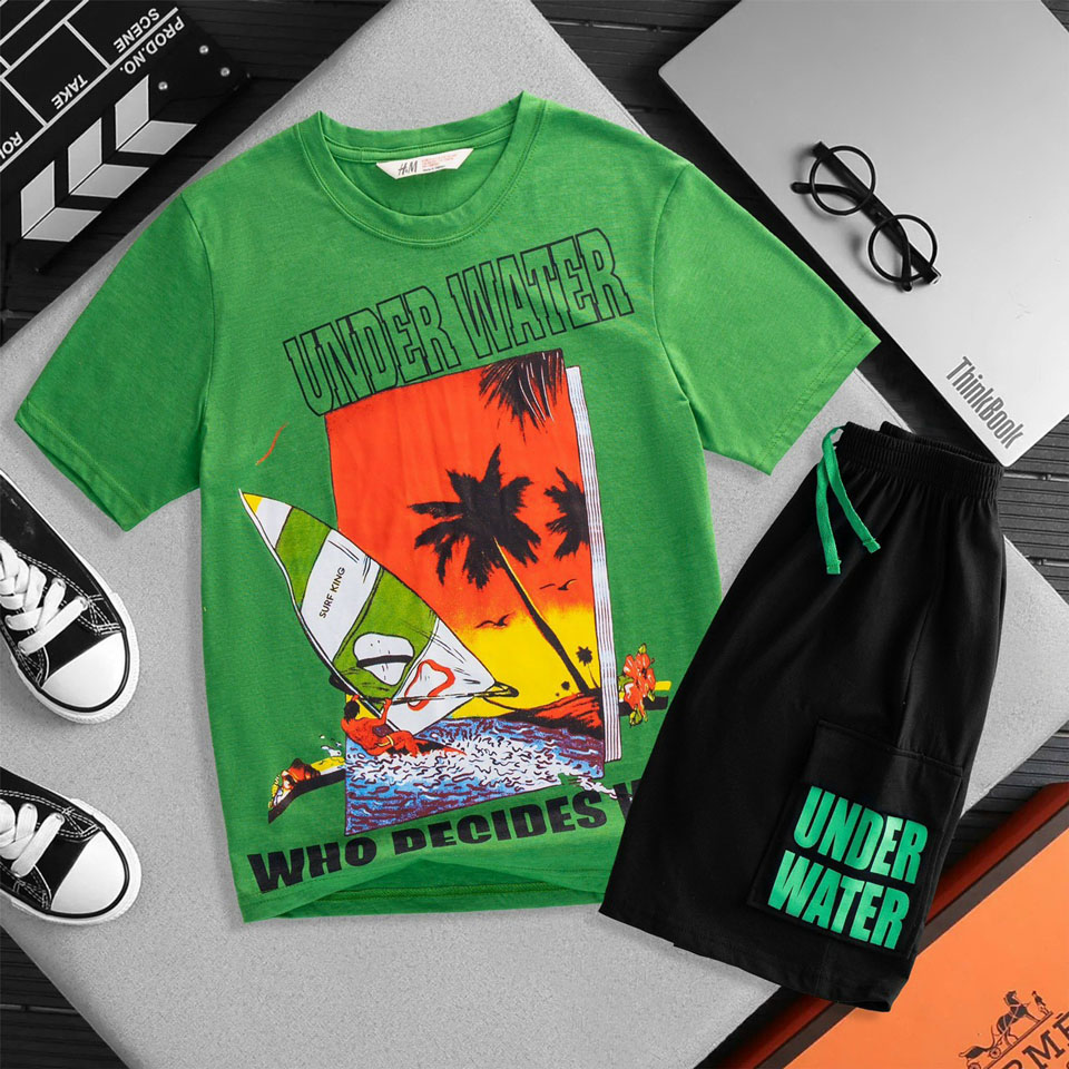 Bộ thun cotton mềm mát in họa tiết thể thao quần túi hộp nam tính cho bé trai