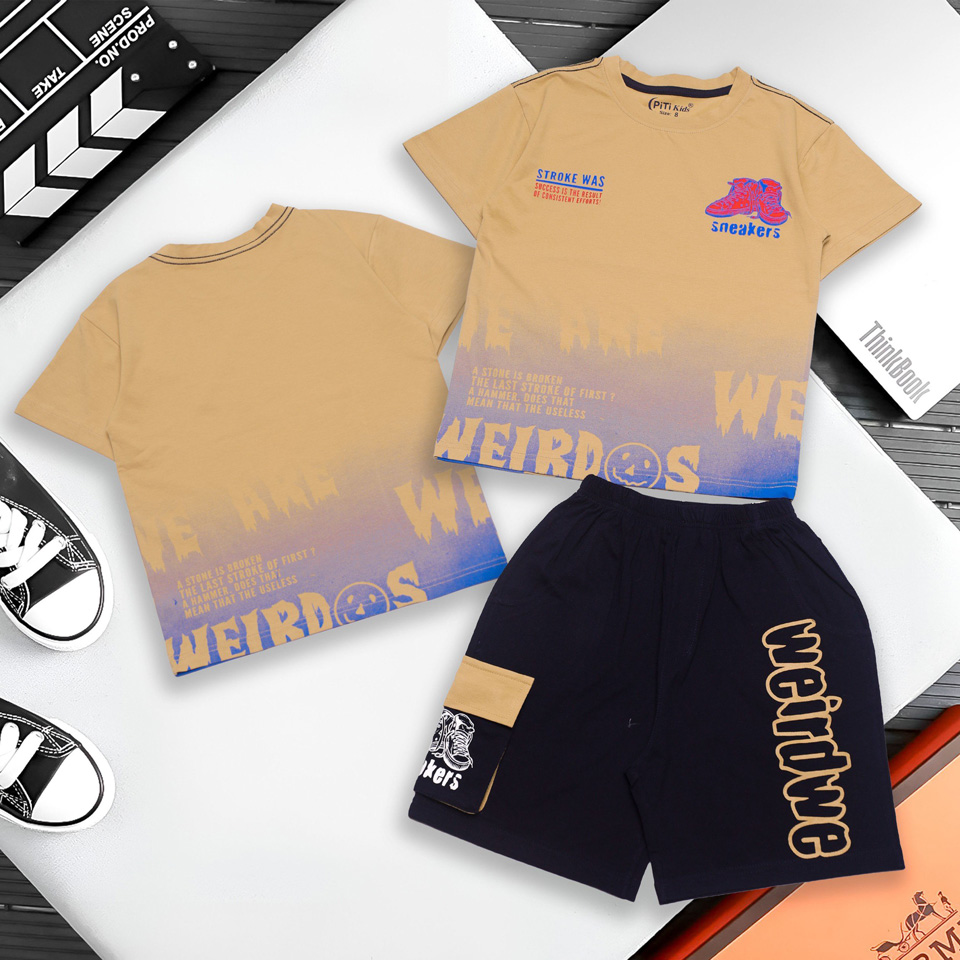 Bộ thun cotton túi hộp in loang size đại cồ cho bé trai 63-85kg màu kem hottrend