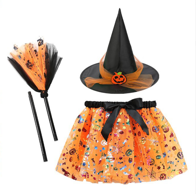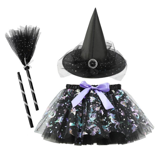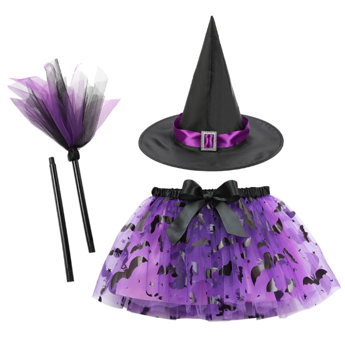 Bộ hóa trang haloween phù thủy váy voan 2 lớp, nón và chổi cho bé gái